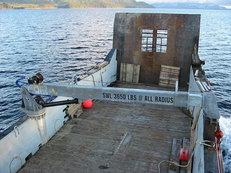 In 2002, a new custom built Hydra-Pro HP30/5T hydraulic deck crane was installed on the M/V Lite Weight. The addition of this telescopic crane has greatly enhanced the capabilities of our vessel. The crane is mounted amidship on the port side, where it can pick, place, and move 4,000 pounds anywhere on the cargo deck. At full extension, it can reach 30 feet from its base on the port side and 10 feet beyond the starboard side. Here are its major features: